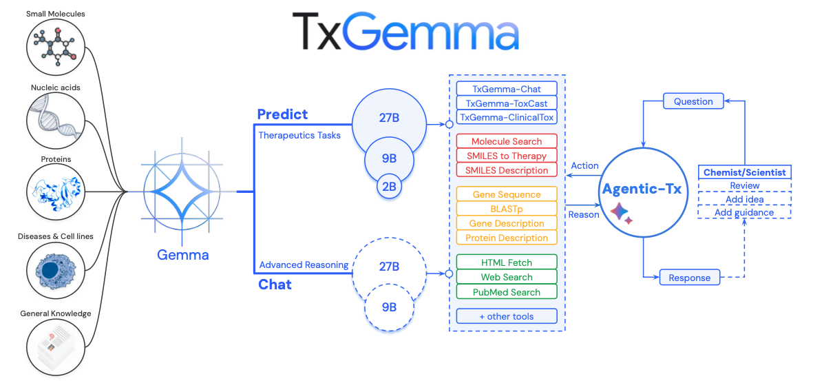 - TxGemma is one subset of the 18 tools available to the Agentic-Tx agent (a Gemma-2-based drug-specialized LLM, covering 5–6 tools)
